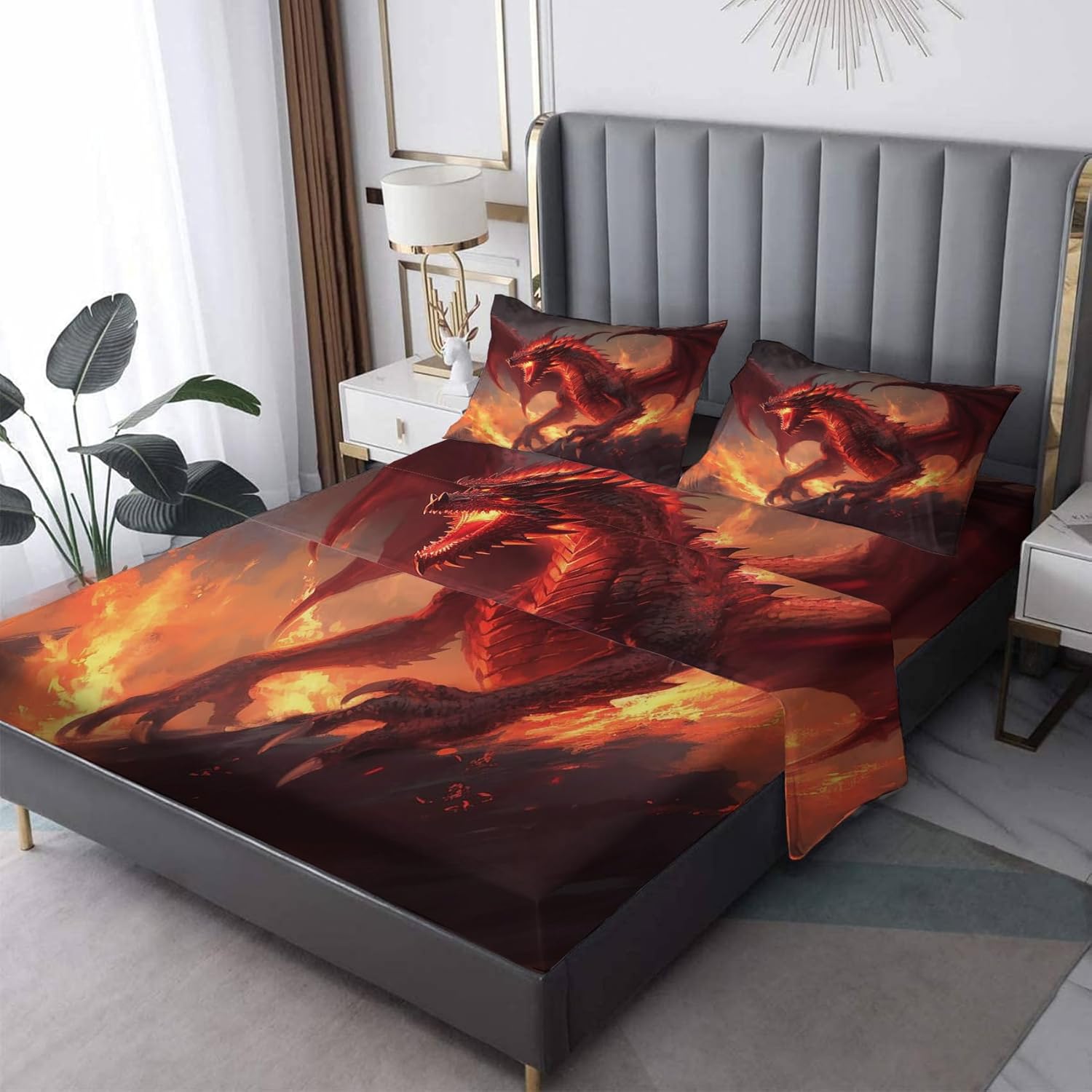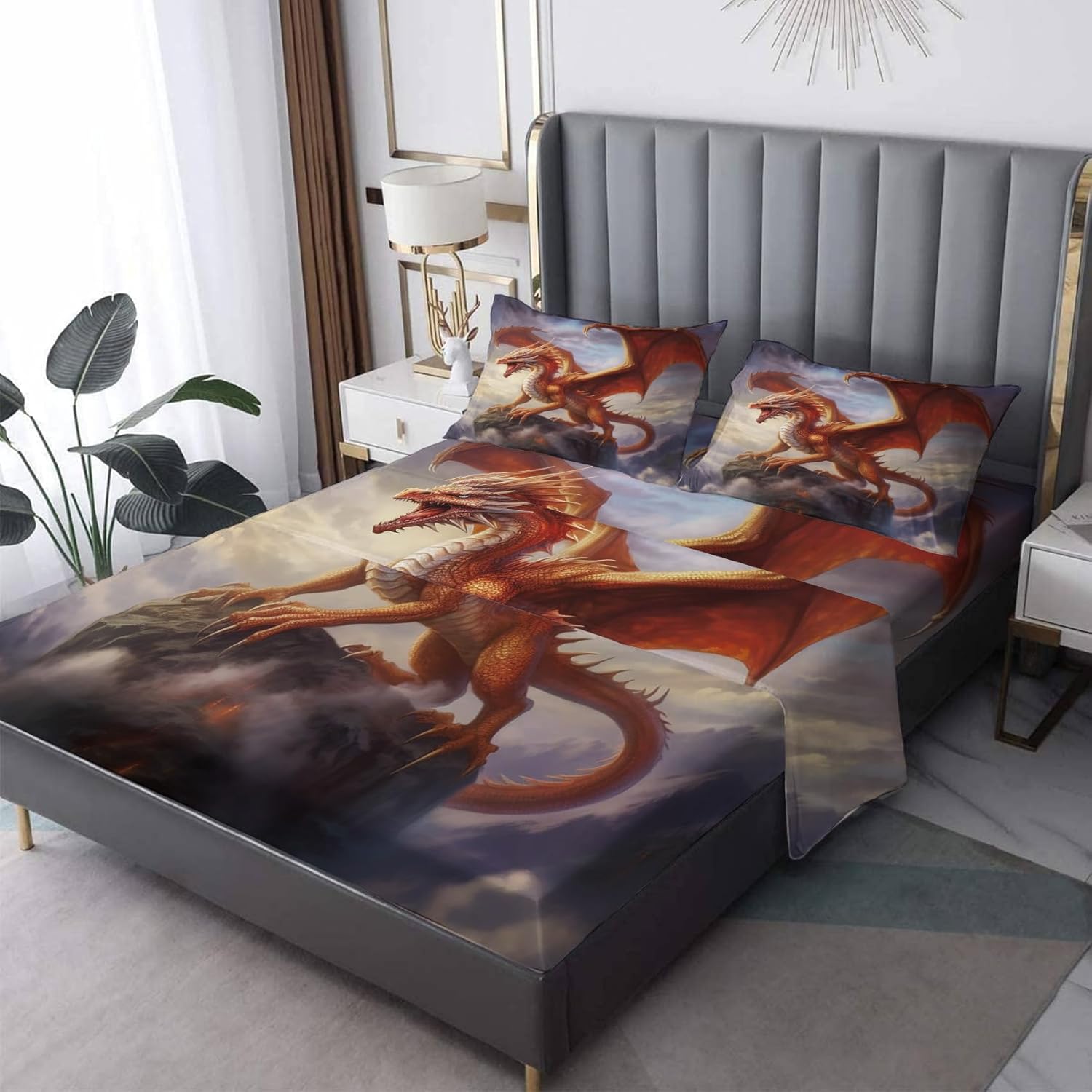 Chinese Dragon Bedroom Decorations & Room Essentials ⭐Premium Material Our bed sheet set is made of 100 percent micro fiber. Ultra soft, silky, lightweight, breathable and high thread count The choice of good quality fabric ensure it anti pilling, no wrinkle, sweat and fade resistant. Also, they are softer and smoother than organic cotton and egyptian cotton bedsheet ⭐Perfect Size Twin size bed sheets 3pcs set: 1 flat sheet 66 x 96 inch, 1 fitted sheet 39 x 75 x 16 inch, and 1 standard pillow case 20 x 26 inch ⭐Decorative Sheet Set Personalized pattern can perfectly decorate your room, bedroom, guest room, RV, kids room, boys room, girls room and make it look vibrant ⭐Ideal Gift This bedding sheets & pillowcases come with a unique pattern design, perfect as a birthday and festival gift for family and friends ⭐Well Made Our sheets feature neat and strong stitching for better strength. Reversible pillow shams with zipper closure, easier to insert and remove the pillow than the button pillowcase ⭐Pet Hair Resistant Don't worry about pet hair anymore, this sheetset won't attract cat or dog hair and you can play with your pet anytime ⭐Suitable for All Seasons Our sheet & pillowcase sets are suitable for spring, summer, fall and winter The smooth feel of the sheet is very cozy which keeps you cool during summer and warm during winter. Hot sleepers can also use with confidence and no sweat ⭐Customer Service If you have any questions about our products, please feel free to contact us, we are happy to serve you